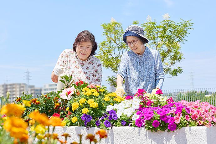 当ホームの屋上庭園は、四季を感じていただける植栽を植えた開放的な空間となっています。なかなかお一人での外出が難しい方でも、早朝、お昼、夕方とさまざまな時間帯に外気を浴びながらお散歩いただいています。お一人でゆったりお過ごしいただくことはもちろん、お仲間とお茶をお楽しみいただくことも。思い思いのゆったりとした時間をお過ごしください。
