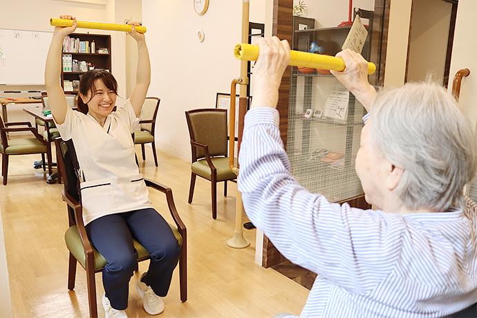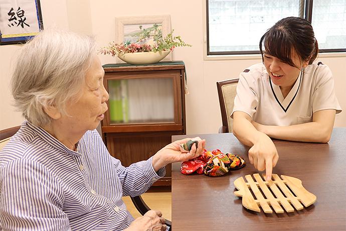 ご入居者様お一人おひとりの「できるようになりたい」「やってみたい」という想いに寄りそい、実現を目指して、日常生活のなかでのリハビリを積極的に取り入れています。手作業やなじみの活動を通して、ご自身の身体機能維持ややりがいを持っていただくことで、その方らしいご生活を送っていただけるよう支援してまいります。