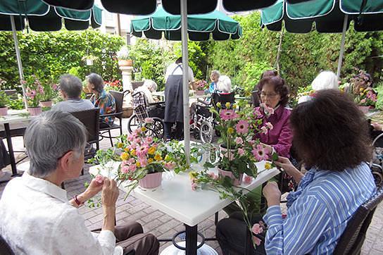 1Fのテラスは、陽当たりが良く、色とりどりに咲いた花を観賞できる大変人気のある場所です。イベント時には、皆様がお弁当を召し上がるスペースとして、ボランティアの方による音楽会の開催時にはステージとして、ご家族様、ご友人様のご来訪時には会話が弾み楽しく歓談できる場所として、色々な形で活用されています。緑を見ながらのお食事やティータイムにもどうぞご利用ください。