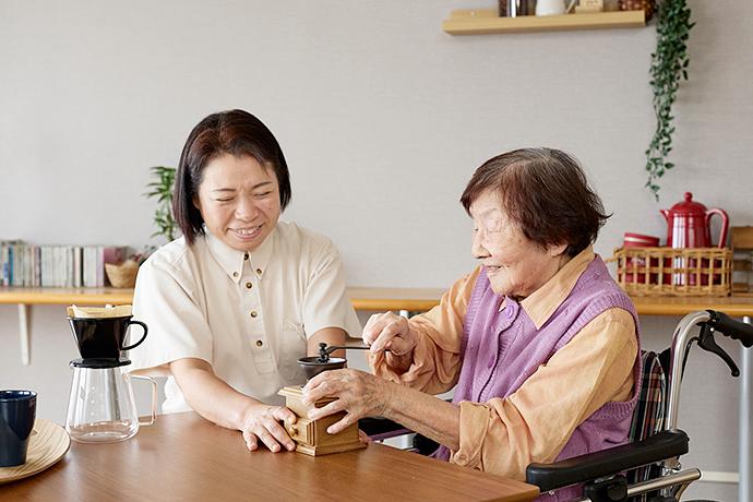 ご自宅と同じようにコーヒーは豆を挽いて ご入居者様の「やりたい意欲」を引き出す「自発支援®(※)」