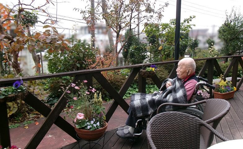 ホームには、広いウッドデッキのスペースがあります。お天気のいい日には、テラスでティータイムをお楽しみいただけます。ウッドデッキから眺めることができるホームのお庭には、梅、桜、アジサイ、柿、ススキなどがあり、季節の移り変わりを感じることができます。