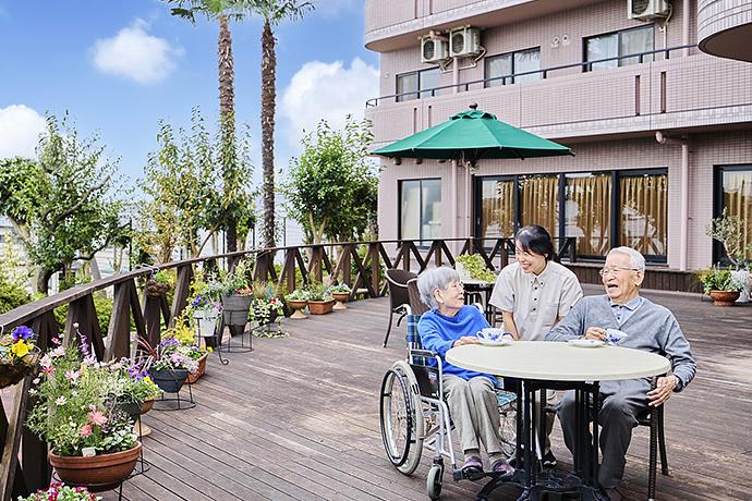 ホームの1階には、ゆったりとした広さのウッドデッキがあります。晴れた日には、ティータイムやくつろぎの時間をお楽しみいただけるほか、ご家族様とのご面会や、お話しの場としてもご利用いただけます。また、脚の筋力維持を目的として、散歩をされながらご自身で歩行リハビリを行われているご入居者様もいらっしゃいます。四季折々の風を感じながら、自然に包まれた穏やかな時間をお過ごしください。