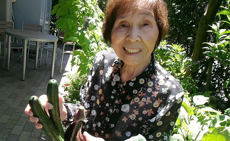 2025.08.06夏野菜の収穫「くらら上大岡」のテラスに置いたプランターで、今年もきゅうりやナスがたくさん育ちました。お天気がいい日に、ご入居者様が収穫されました。「大きなのがたくさん育ちましたねえ」と暑さを忘れて楽しそうなご様子でした。収穫したきゅうりとナスは浅漬けにして、ほかのご入居者様と一緒に召し上がっていただきました。
