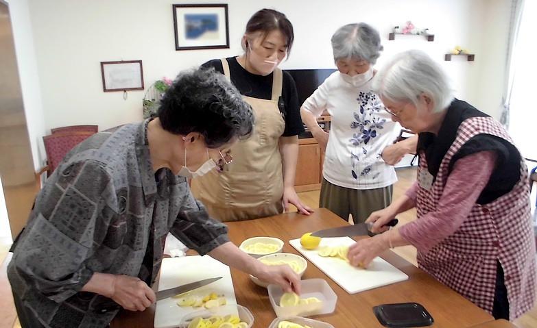 2025.08.21レモンのシロップ漬けレモンのシロップ漬けを作りました。主婦歴の長いご入居者様の皆様が絶妙な薄さで手早くレモンを切られる作業はお見事で、レモンの爽やかな香りが暑さを吹き飛ばしてくれるようでした。数日漬け込み、体操のあとなどに水割りや紅茶に入れてレモンティーにするなどして、皆様と楽しみたいと思います。