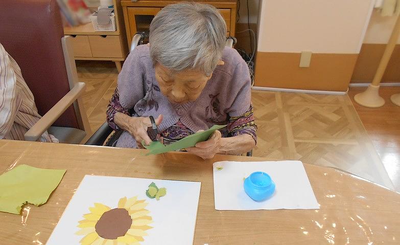 当ホームではアクティビティをほぼ毎日実施し、いきいきとした暮らしのご提案に努めています。ちぎり絵のアクティビティでは、昔懐かしい風景のちぎり絵を作成しているご入居者様のお姿が見られました。昔のことを思い出し、ご入居者様同士でお話ししながら指先を使うことで刺激にも繋がり、認知機能の維持も期待できます。そのほか、身体機能維持を図る集団体操やお料理アクティビティ、書道教室、華道教室など、楽しみながら機能維持につながるようなアクティビティの企画に取り組んでいます。