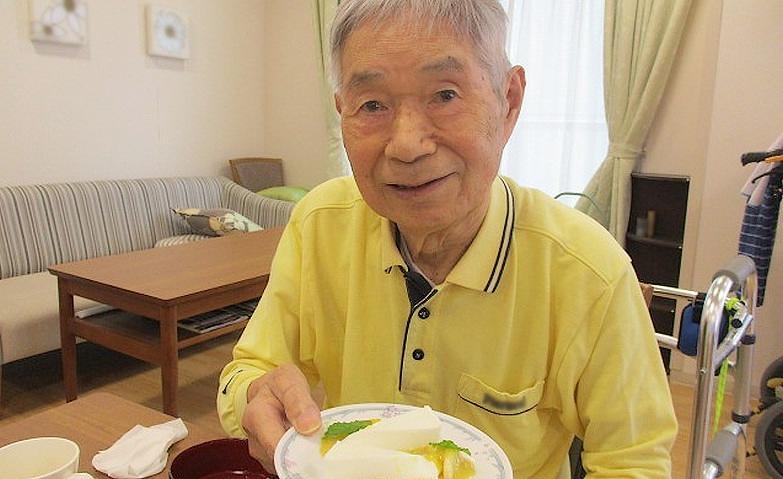 2025.07.13父の日のデザートこの日の昼食は、父の日特別メニューを提供させていただきました。こちらのご入居者様はレモンケーキを片手に、にっこり笑顔を見せてくださいました。いつもありがとうございます!