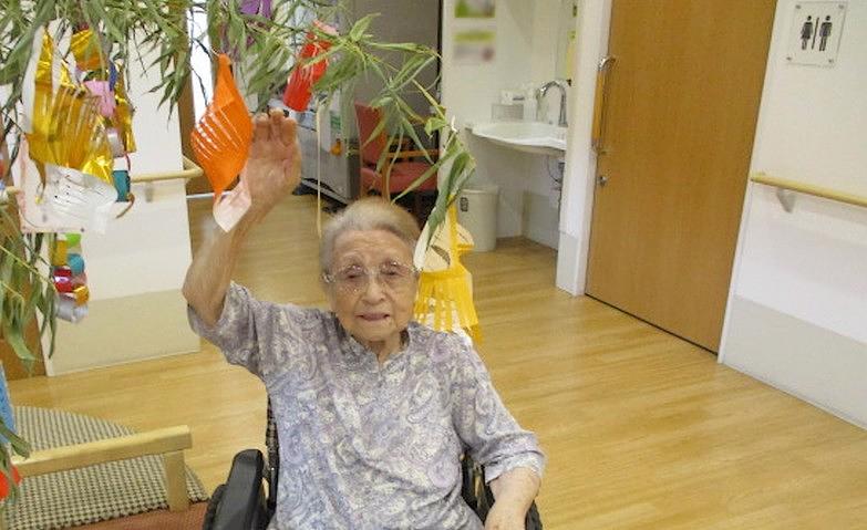 2025.07.13七夕飾りと記念撮影この日は、七夕飾りと一緒に記念撮影を行いました。ご自分で書かれた短冊を探しながら、「これ私が書いた短冊だね」とスタッフへ紹介してくださりました。 願い事がかないますように!