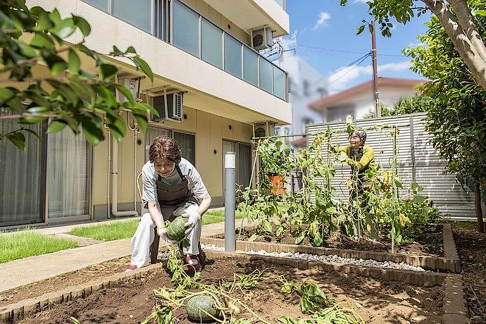 中庭で野菜を収穫されるご様子 ご入居者様が主体となって創り上げていく「自慢の中庭」