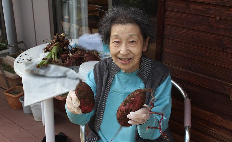 ホームの中庭で野菜を収穫されているご入居 ご自分の趣味をこれからも続け、暮らしにハリや楽しみを。