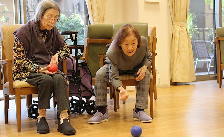 当ホームでは、皆様にいつまでもお元気な身体を保っていただけるよう、朝にはラジオ体操や音楽に合わせたリズム体操を行っています。また通常週に1回機能訓練指導員による集団リハビリ体操を行い、ご入居者様に、楽しみながら身体を動かしていただくことを目標に、介護予防にもつなげていただいています。