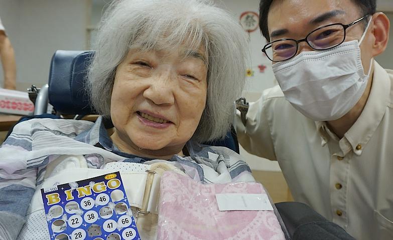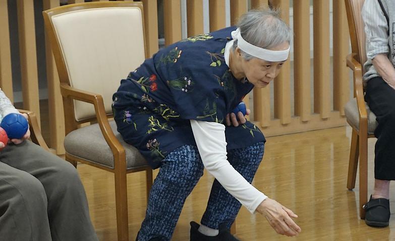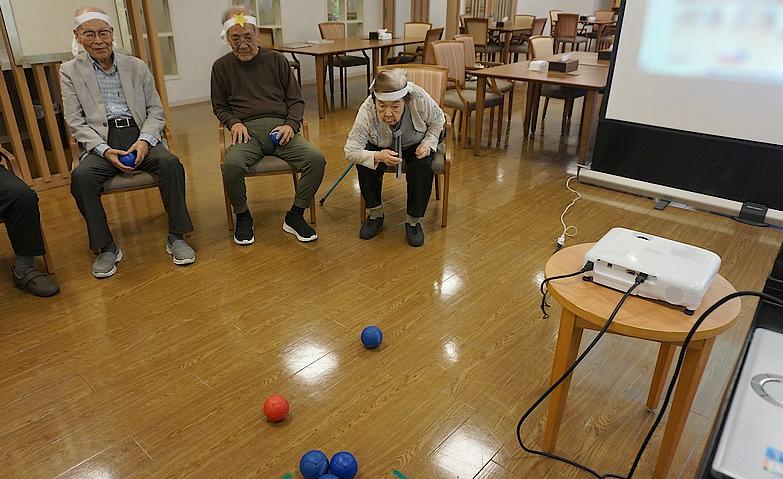 2025.11.14ゲームを楽しみますこの日のアクティビティはボッチャです。2mほど先の的を狙ってボールを転がします。隣のご友人とは持っているボールの色が異なるので、ライバルチームということになりますが、いつもは仲良く麻雀をされている親友です。しかし投げる瞬間は真剣そのもの。ただ、終わってしまえばまた仲良くおしゃべりを楽しまれるお二人です。