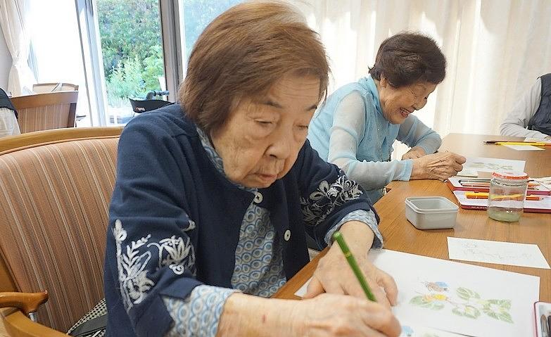 2025.10.17どんどんうまくなっていきますね~今日は絵画教室の日です。絵画といっても本格的なものではなく、色鉛筆を使って塗っていきます。色鉛筆といって高をくくってはいけません。色鉛筆で塗ったとは思えないほど繊細な色使いと鮮やかなグラデーションで、見事に絵を仕上げていらっしゃいます。いつも参加されている方は、そのたびごとに腕を上げているようですよ。