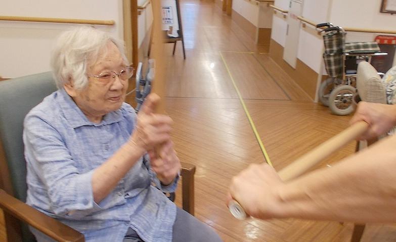 2025.08.20棒を使って体操!今日は棒を使った体操アクティビティを行いました。お写真は棒を竹刀のように持ち、腕の体操をされているご様子です。ほかには柔軟体操などを行いました。「こういうのがあっても楽しいわね」とおっしゃり、皆様しっかりとお身体を動かしてくださいました。