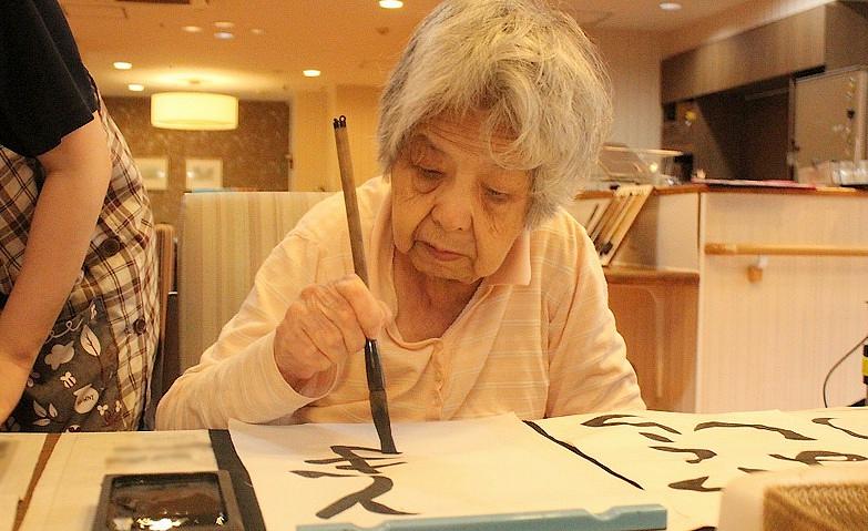 2025.08.20書道教室今日は書道教室を開催しました。今回も特にテーマを決めず、自由にお好きな字を書いていただきました。「私はこの夏に食べたいものを書く!」ということで、「梨」「いくら」と書かれる方もいらっしゃいました。「ぜひこの願いをかなえて差し上げたい」と思った瞬間でした。