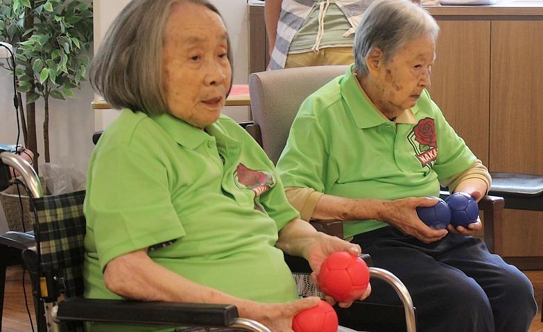 2025.08.14スタッフとキャッチボール今日は午後の時間を使って、ご入居者様とスタッフでキャッチボールを行いました。ご入居者様とスタッフで向き合って座り、数を数えながら実施しました。スタッフが「お上手ですね」とお声をかけると、「そんなことないよ」とおっしゃりながら、しっかり両手でボールをキャッチしていらっしゃいました。