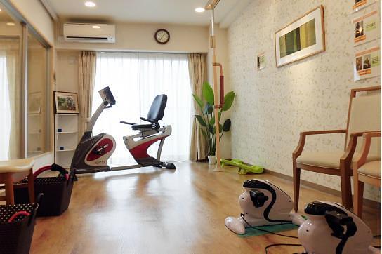 リビングルーム兼食堂兼機能訓練室に設置したサイクルマシン、足こぎペダルなどを自由に使っていただき、ご自分の身体の状態やペースでご利用が可能です。