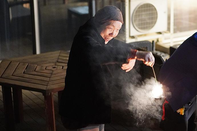 花火をされているご入居者様 楽しい夜を皆様で。ナイトアクティビティで笑顔と交流が深まるひとときを。