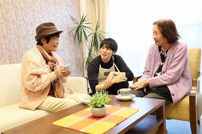 談笑されているご入居者様とスタッフ 居心地のいい空間で、心温まるひとときを。