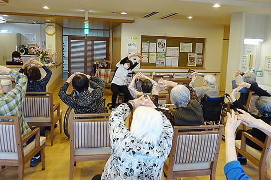 機能訓練指導員による集団リハビリを通常週3回実施しております。ボールを使った運動やゴムバンドを使用した運動など、皆様で楽しみながら無理なく行えるリハビリを実施しております。毎回参加していただけるように工夫をしながら、ご入居者様の身体機能の維持、向上に取り組んでいます。