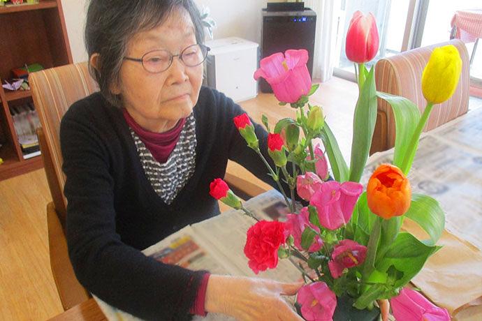 フラワーアレンジメントに取り組まれるご入居者様 五感の刺激を目的としたフラワーアレンジメント