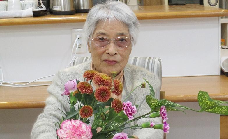 当ホームでは通常毎月フラワーアレンジメントを開催しています。ご参加されたご入居者様は、季節のお花を選定され、想像力を働かせてすてきな作品を制作してくださります。花の香りや彩り、花びらの触感が五感へ心地よい刺激を与え、脳を活性化させることで認知症予防にもつながると考えます。ご参加いただく皆様は毎回楽しそうに会話されながら明るい表情で取り組まれています。