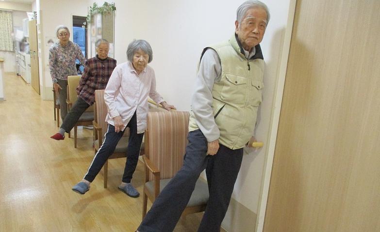 当ホームでは通常毎週1回、機能訓練指導員による集団体操を実施しております。機能訓練指導員のかけ声のあとに皆様もご一緒に声を出されながら体を動かしていただいております。日常生活ではなかなか使わない筋肉を動かし適度な負荷をかけることで、運動しながら心のリフレッシュにもつながります。集団体操を通して、認知症予防や嚥下機能低下予防に努めてまいります。