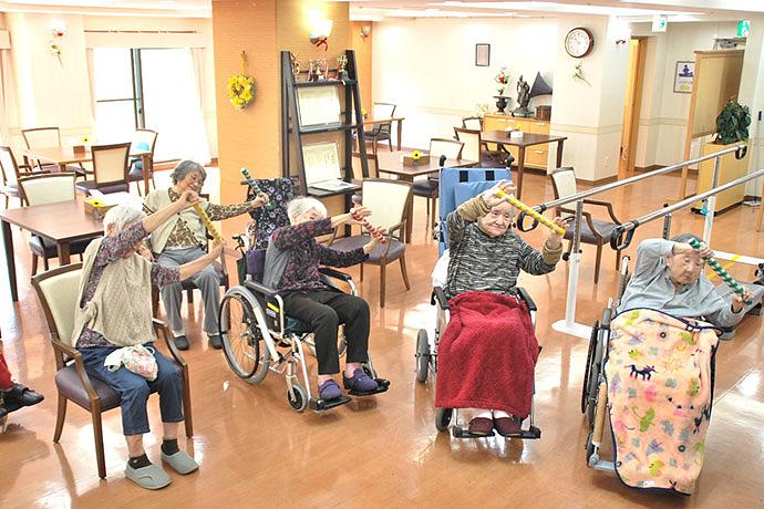 身体を動かすことは、身体機能維持のためにとても大切なこととされています。当ホームでは、通常毎日「朝の体操」を実施し、日中のアクティビティでは、身体機能向上を目的とした「体操」を積極的に取り入れております。むずかしい動作だけではなく、簡単な動きも取り入れることで、お身体の状態に合わせて多くのご入居者様に参加していただけるような工夫もしています。他のご入居者様と一緒に身体を動かすことが楽しいと思える空間、環境をこれからも提供できるよう努めています。