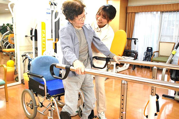機能訓練指導員が作成する個別のプランのもとに行う個別リハビリでは、お身体の状態やご要望に合わせて、生活の質(QOL)の向上を目指した多様なプログラムを機能訓練指導員がご提案。このほかにも、足腰が不安な方の筋力維持を目的とした体操や、リハビリ機器を使用した運動などを通して機能向上や精神面(こころ)のサポートを図ります。歩行訓練などは、機能訓練指導員の作成したリハビリプランのもと介護職員が行い、安心感のある生活を送っていただけるようお手伝いをさせていただきます。