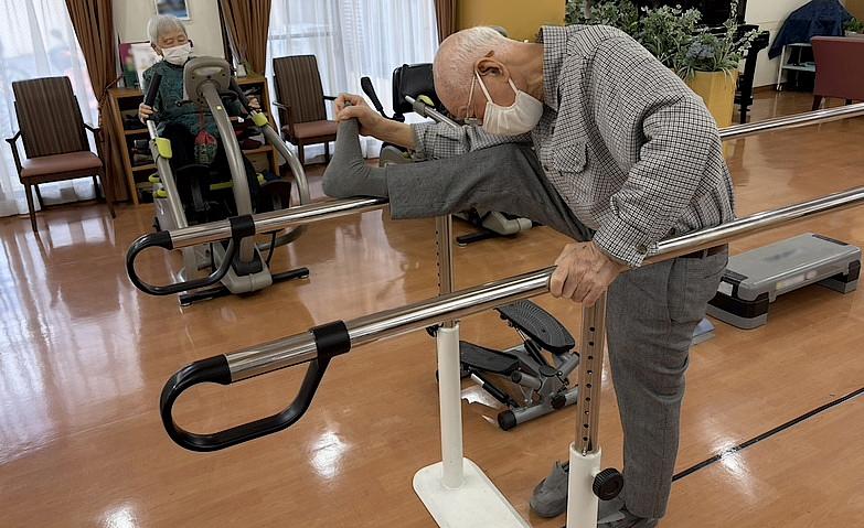 リハビリに取り組まれるご入居者様 日常生活にリハビリを取り入れ、身体機能の維持向上を目指しています。