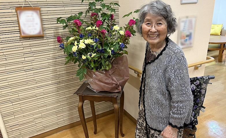 2025.07.14日常のひとコマ「メディカル・リハビリホームボンセジュール草加」の玄関前には、色鮮やかできれいなお花を飾っていて、通常毎週水曜日に入れ替えを行っています。お写真のご入居者様は、毎日のようにお花の様子をご覧になり、毎週水曜日のお花の入れ替えを楽しみにしてくださっているそうです。
