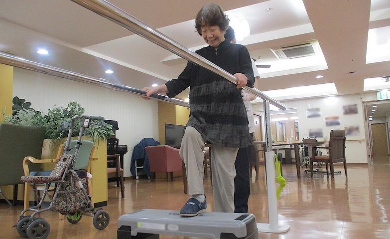 2025.06.22踏み台に乗るリハビリを今回は、機能訓練指導員によるリハビリの様子をご紹介いたします。ホームの1階ダイニングルーム兼機能訓練室内にはリハビリスペースがございます。機能訓練機器は、ご自由にお使いいただけます。こちらのご入居者様は平行棒につかまりながら踏み台に乗り、足を高く上げる練習をされています。「以前より足が上がらないわ」とおしゃりながらも、リハビリに励んでいらっしゃいました。