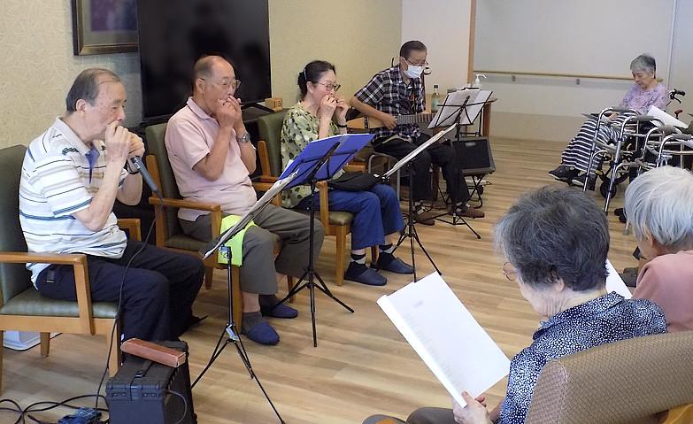 2025.08.20すてきなハーモニーのハーモニカ演奏会ハーモニカを演奏してくださる方々を外部よりお招きし、皆様に馴染みのある音楽を奏でていただきました。すてきな音色で皆様からは「いいわね」「音楽がすごく好き」「こういう機会は嬉しいわ」など、嬉しいお言葉をいただくことができました。