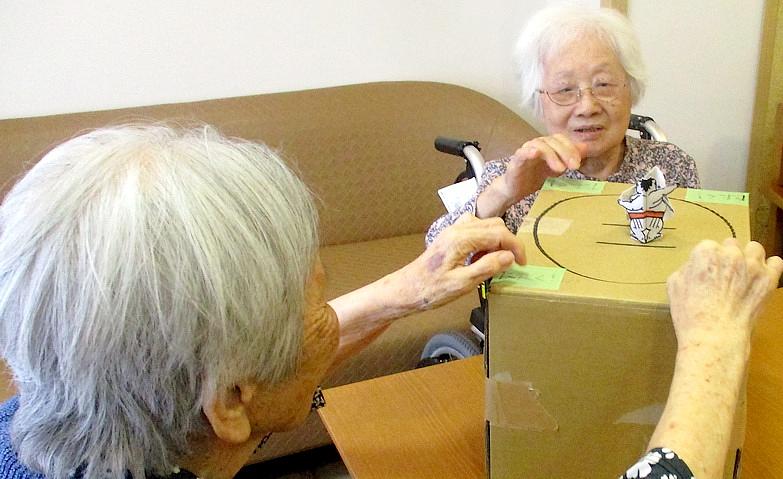2025.08.14オリジナルの作品で勝負!とんとん相撲先日、ご入居者様がご自身でデザイン・作成された人形を使った「とんとん相撲」を開催しました。「勝つわよ!」「楽しいね」「惜しかったわ」など、周りでご覧なっている方も一緒に大盛り上がりでした。皆様白熱した勝負を楽しんでいらっしゃるようでした。