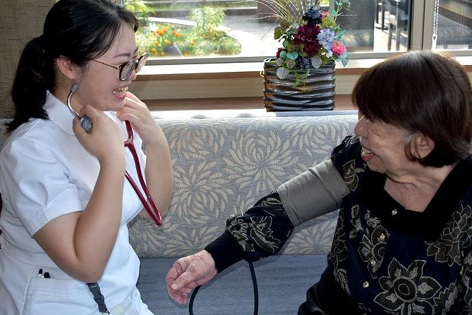 看護職員は、胃ろう・たんの吸引など、昼夜を問わず医療的ケアにも対応。介護職員と連携しながら日々のご様子の変化に目を配り、かかりつけ医の指示のもと健康管理を行います。