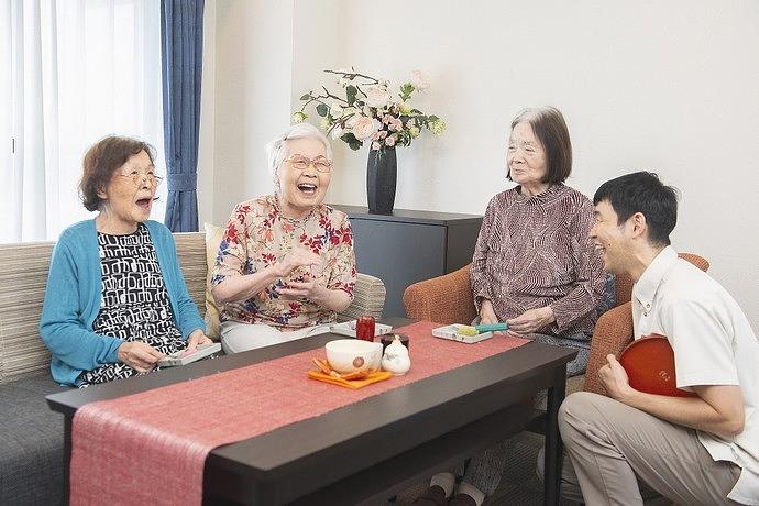 日常を過ごすホームでは、ご入居者様に今までのご生活を快適に続けてただきたい思いから、多彩な活動が実施できるよう空間も整備しています。5階には図書コーナー、6階には調理器具を備えたキッチンなどを完備。お茶会サークルでは、茶道ご経験のご入居者様が集まり、開催しています。お一人ではできないことや続けたいことなどをホームのスタッフがサポートをさせていただきながらご入居者様の「○○したい」を実現できるよう努めています。