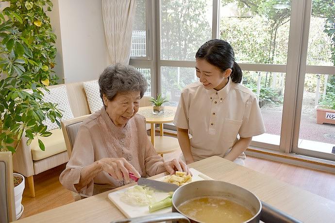 その方の「したいこと」「好きなこと」「できること」を大切にし、ご入居者様を深く知ることでその方らしくお過ごしいただけるようお手伝いをさせていただきます。例えば料理倶楽部では、包丁を使って食材を切ったり炒めたりと、ご入居者様主体で活動いただき、スタッフはそばで見守りながら難しいところをお手伝い。「自分でやりたい」というお気持ちを尊重し、ちょうどいいお手伝いを心がけています。ホームでお仲間やスタッフと一緒だからこそできたと感じていただけるよう、皆様の想いの実現に向けて一緒にサポートさせていただきます。