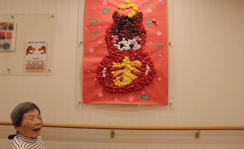 「まどか府中」では通常毎月1回、ご入居者様がひとつのフロアに集まられ、タペストリーを作成されています。季節ごとの絵柄に合わせて、色紙を丸めるところから始まります。「これは、こっちに貼って」「うまく付かないね」などお話しされながら、ひとつひとつ丁寧に貼られ、指先の運動、頭の体操にもなっていると考えています。皆様で協力をしていただきながら、ひとつの作品を作りあげられたときの笑顔が、1番の宝物です。