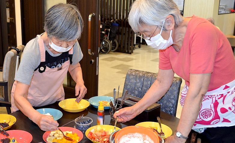 2025.07.24パンケーキ作り先日、パンケーキ作りを行いました。ブルーベリーやメロンなどのフルーツとあんこをご用意し、当ホームでとれたトマトもトッピングに使いました。焼き上がったパンケーキにお好きなものをトッピングして完成です。皆様とてもおいしそうに召し上がっていました。