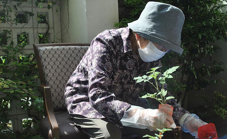 2025.07.09大きくなりますように!今日は、夏に向けてトマトの苗植えをしました。より多くのご入居者様に成長を見ていただけるように、ウッドデッキや屋上庭園など、さまざまな場所に植えた苗を配置しました。お写真のご入居者様も「大きく成長しますように」と、毎日のようにトマトの様子を確認され、水やりをしてくださっています。