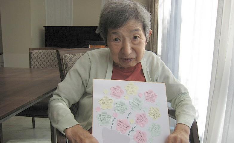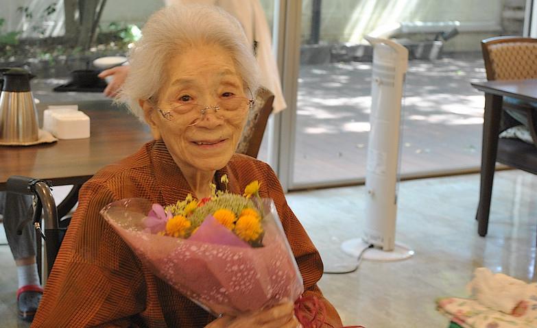 2025.09.18特別な日笑顔がすてきなこちらのご入居者様。この日、100歳のお誕生日を迎えられました!百寿のお祝いとして、スタッフから色紙と花束をお渡しさせていただきました。「100歳を迎えられて嬉しいです」と、色紙をご覧になりながら嬉しそうにお話ししてくださいました。
