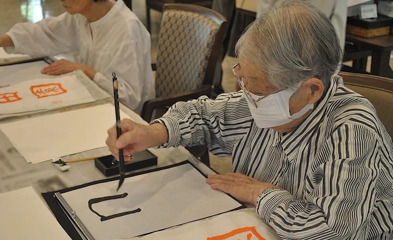 2025.06.25気持ちを込めて今日のアクティビティは、通常月に1度開催している書道でした。外部より講師の方をお招きし、季節に合わせた言葉を書いていただきます。参加されたご入居者様は、お手本を確認して、一筆一筆丁寧に書かれているお姿が印象的でした。完成した作品は、当ホームの廊下に展示させていただき、ほかの皆様と感想をお話しされていました。
