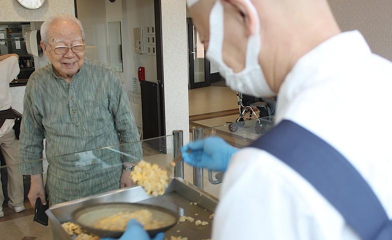 「エバーグリーン」と称した、最上階5階のダイニングルームでは、通常のお食事の他に、通常毎月2回ご入居者様の目の前で、熱々の鉄板で調理する「ライブキッチン」といった実演メニューなども実施し、皆様にお食事をより一層楽しんでいただく工夫をしてまいります。