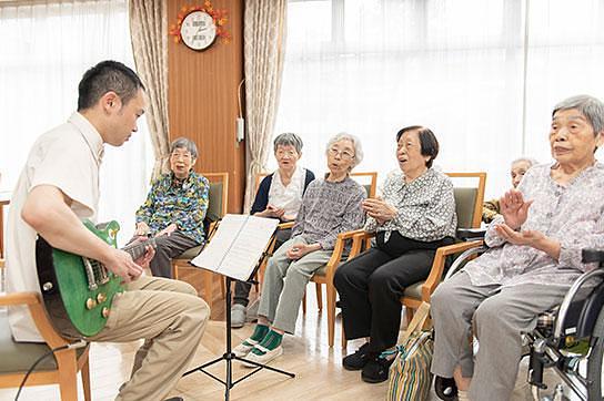 誤嚥性肺炎などの疾患を予防するために、当ホームでは口腔・嚥下体操に力を入れています。そこでは単調な発生練習を繰り返すのではなく、スタッフの演奏するギターやピアノの演奏に合わせて歌っていただく、「アクティビティ」として体操を実施することで、皆様には、楽しみながら体操に取り組んでいただけているよう工夫しています。