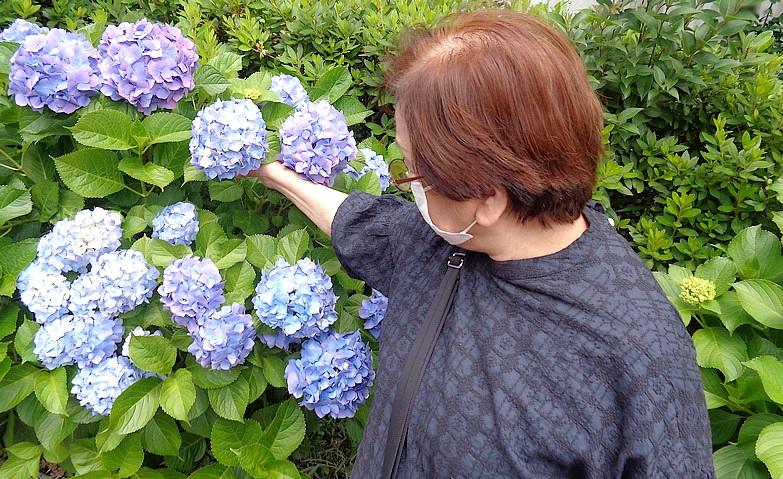 2025.06.25アジサイがきれいです!お散歩アクティビティで、スタッフと一緒にお散歩をされている際のひとコマです。屋外の心地よい風や日差しを感じていただきながら、沿道のきれいなお花を鑑賞されました。今回はちょうどアジサイがきれいに咲いていました。季節の移り変わりを肌で感じられ、楽しく運動をできたご様子です。