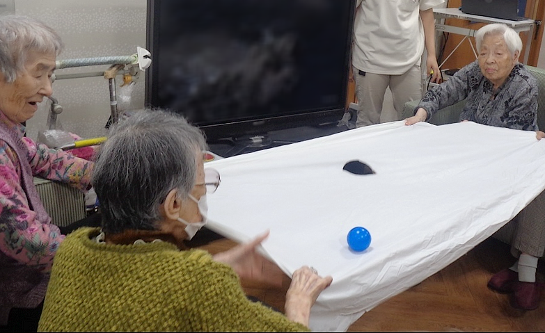 2025.07.27「キープ・ザ・ボール」アクティビティ布をじょうずに使って、ご入居者様同士で協力をしながらボールを落とさないようにする、「キープ・ザ・ボール」アクティビティを行いました。「もっと引っ張ってみて」「いいわね~」「あぁ、落ちちゃった」などの声掛けがみられました。皆様の表情も、真剣な顔をされたり、笑顔を見せながらと楽しそうに取り組まれていました。