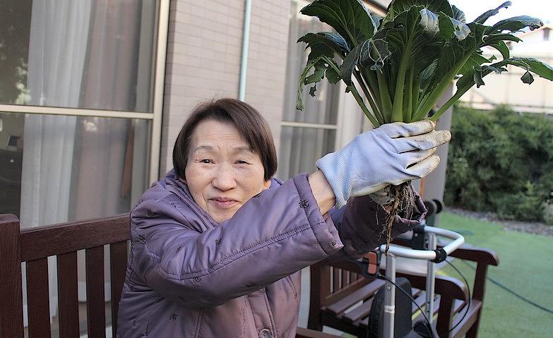 当ホームの中庭にある畑「青空ファーム」では、季節ごとのお花だけではなく、ご入居者様からのご希望でお野菜なども植えています。毎日のように水やりとお手入れを念入りに行い、愛情いっぱいに育ったお野菜を皆様で収穫。お野菜はジュースやケーキにするなどして日々の生活に取り入れることで、皆様の生きがい・やりがいにもつながっています。