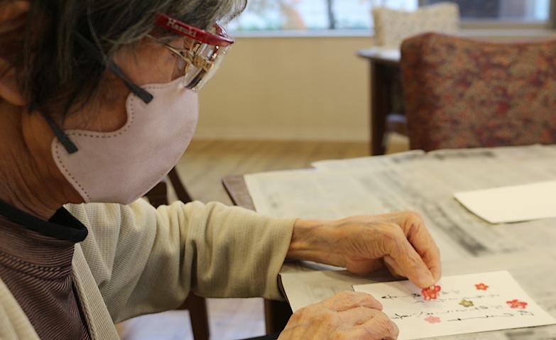 私たちは、手指や脳に刺激を与えることは、認知症予防にも繋がると考え、手先や頭を使った脳トレのプログラムを実施しています。小さな色付きのピースをベースにはめ込み、さまざまな種類の模様やイラストが作れるパズルは、当ホーム一押しのプログラムです。作品をお一人でコツコツ作ったり、グループで作業分担しながら大作を作り上げたりと、どなたでも気軽に楽しみながら取り組んでいただくことができます。