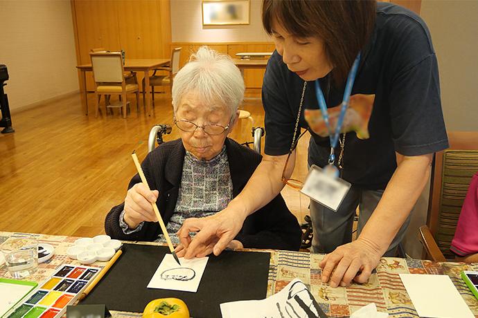 近隣の狛江地域の皆様を講師としてお招きし、通常2か月に1回、「絵手紙教室」を開催しています。ほかにも、地域の方のバンド演奏会や、エントランスホールのピアノで自由に楽しんでいただく会なども開催しており、地域の方との交流を深めさせていただく取り組みを行っています。町内会の行事などに参加いただくことで、地域への所属感や貢献を感じていただくことも目的としています。人の温かさに触れることで、外出のきっかけが生まれ、交流の幅も広がっているお姿も見られます。