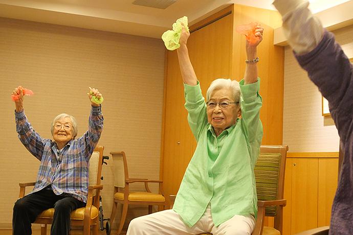 介護度進行予防運動の専任スタッフが、ご入居者様の目標に合わせて筋力トレーニングや関節の可動域運動など、複数の運動を組み合わせたプログラムを通常毎週月曜日と木曜日に実施しています。お身体の状態に応じた身体機能の維持・向上を目的としたプログラムを提案・実施することで、皆様がこれからもいきいきとした暮らしを送れるよう、しっかりとサポートしてまいります。