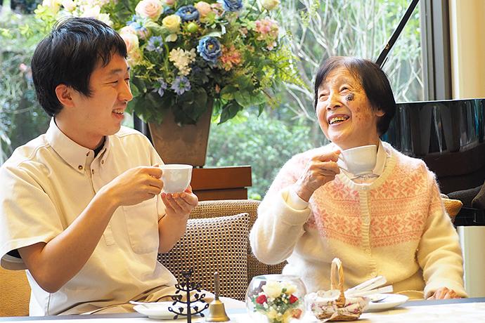 スタッフと談笑されているご入居者様 ご入居者様の想いの実現のために